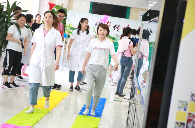 活动开始前,工作人员根据报名人员进行分组,大家按照组队参与游戏环节。踩指压板,大家主动脱去鞋袜,虽然脚底的疼痛让他们不禁喊了出来,但依然满面笑容坚持走完!“走指压板可以疏通经络,调节气血,促进新陈代谢。”一名护士为鼓励队友,将走指压板的好处脱口而出,这么一个小小的细节就可以发现我们医护人员的知识储备是非常充足的……