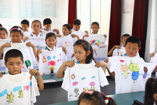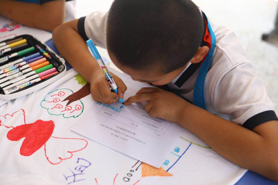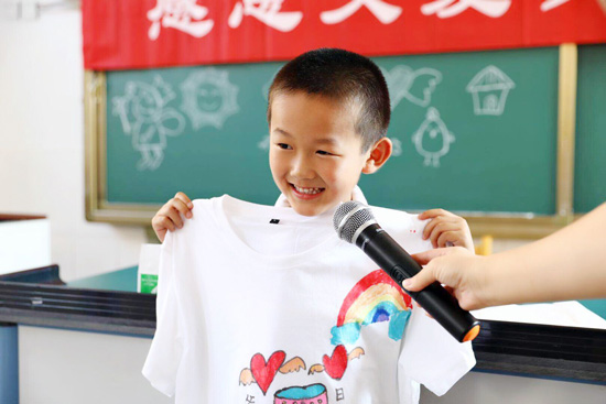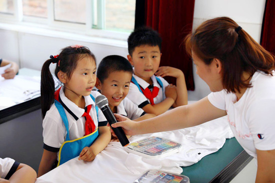五颜六色的颜料,一字排开的画笔,活动开始后小朋友开动脑筋,在白色T恤衫上画上了各种图案。有的画了自己和爸爸手牵着手散步,有的画上了一颗爱心表达对爸爸的爱,还有的画了爸爸背着小小的自己……经过小朋友们的一番创意改造,原本平常的白T恤让人眼前一亮。“常说女儿是父亲的贴心小棉袄,我要把自己画的小T恤送给爸爸,夏天爸爸就可以穿我画的新衣服了。”小朋友开心地说道。