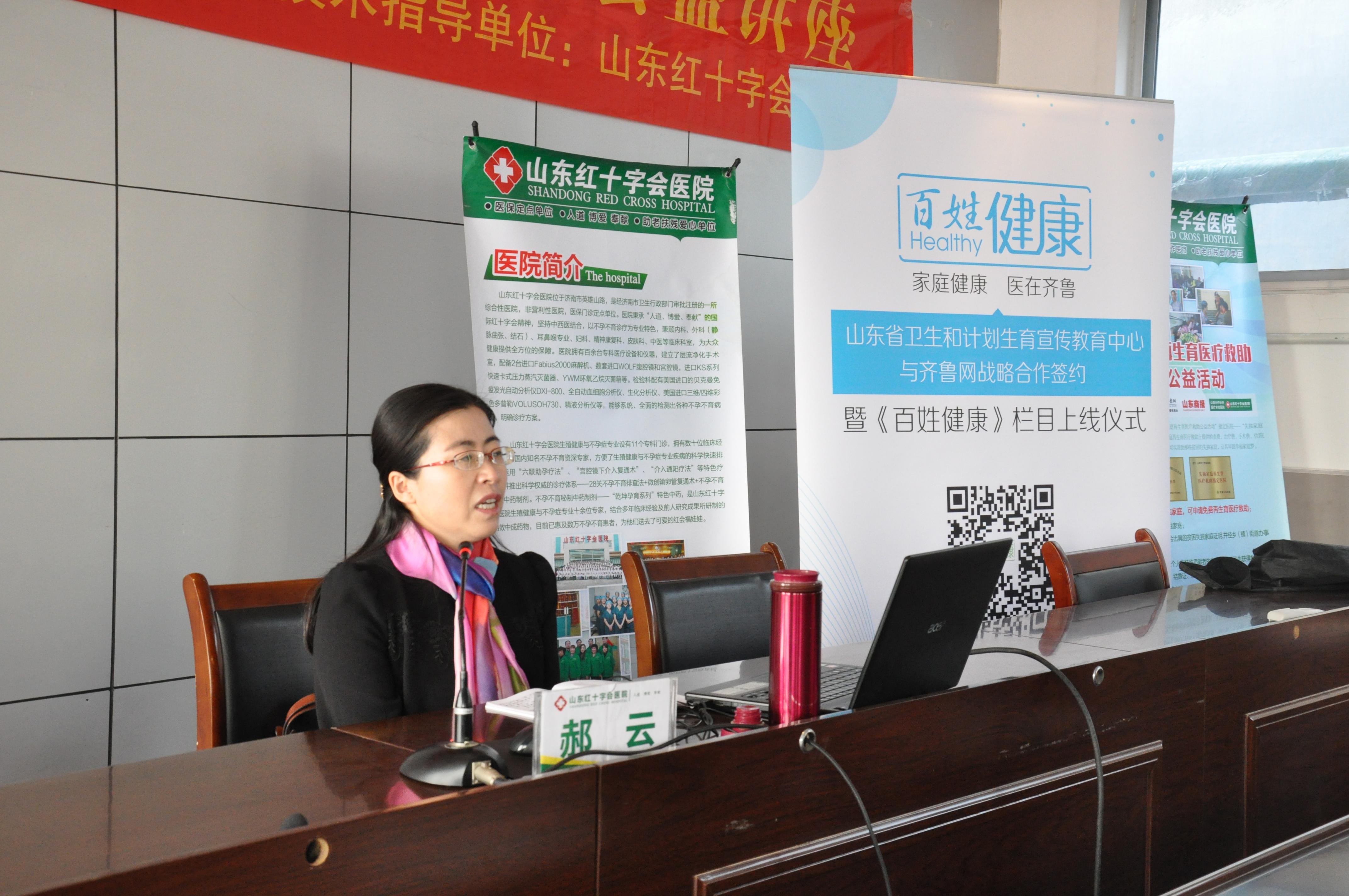 2015年10月29日上午,山东广播电视台齐鲁网与东阿县计生办共同举办的健康山东行科学备孕公益讲座在潍坊市寒亭区高里街道计生站举行,山东红十字会医院专家郝云主任讲解健康备孕和生殖健康知识。